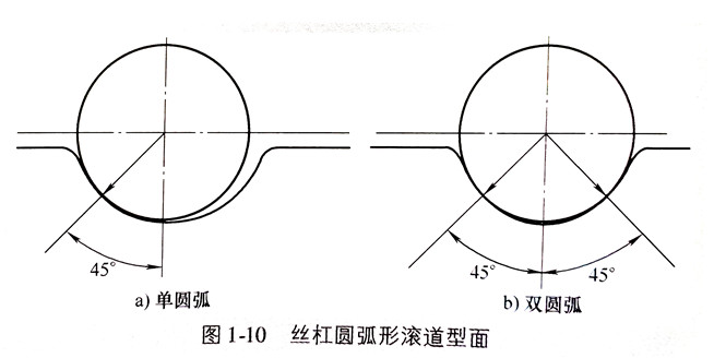 螺紋滾道型面是指通過(guò)滾珠中心作螺旋線的法截平面與絲桿、螺母螺紋滾道面的交線的形狀。這個(gè)型面也稱為螺紋法向截形。這個(gè)滾道型面的幾何形狀、尺寸以及材料的機(jī)械性質(zhì),對(duì)滾珠螺旋傳動(dòng)的承載能力、摩擦特性、軸向剛度和軸隙調(diào)整均有較大影響?;谏鲜龈饕蛩氐目紤],目前國(guó)內(nèi)應(yīng)用得最廣的滾道型面,有單圓弧形和雙圓弧形兩種。如圖1-10所示
