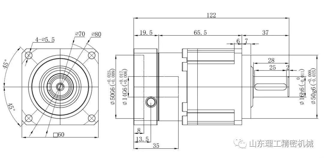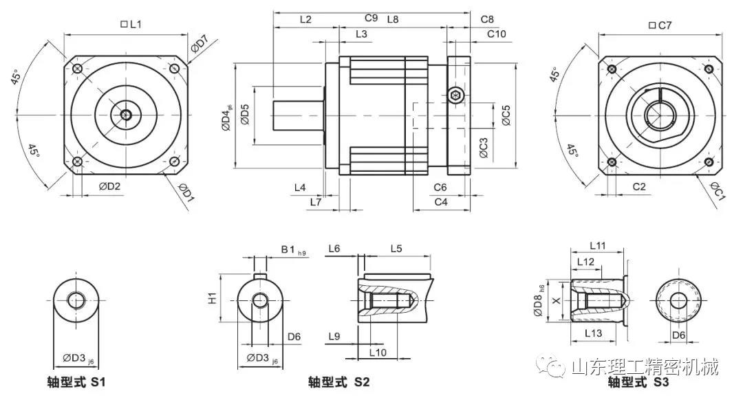 例如這樣一個(gè)圖紙,第一個(gè)接口是減速機(jī)與伺服電機(jī)的接口,這個(gè)通常是需要定制的,減速機(jī)生產(chǎn)廠家會(huì)根據(jù)客戶選擇的伺服電機(jī)的接口來(lái)定制減速機(jī)的接口,所以在和減速機(jī)供應(yīng)商溝通的時(shí)候,你需要提供伺服電機(jī)的接口給他們。